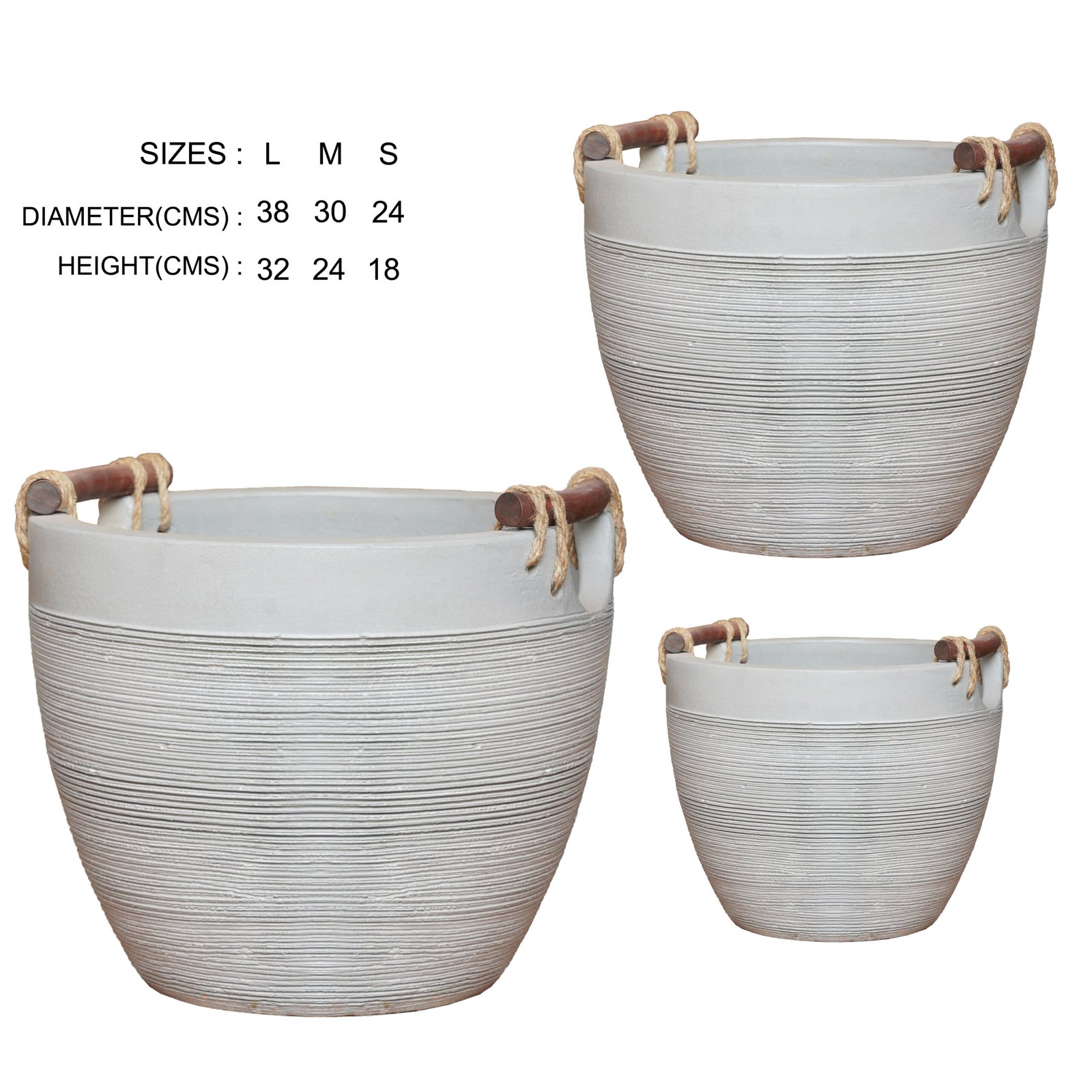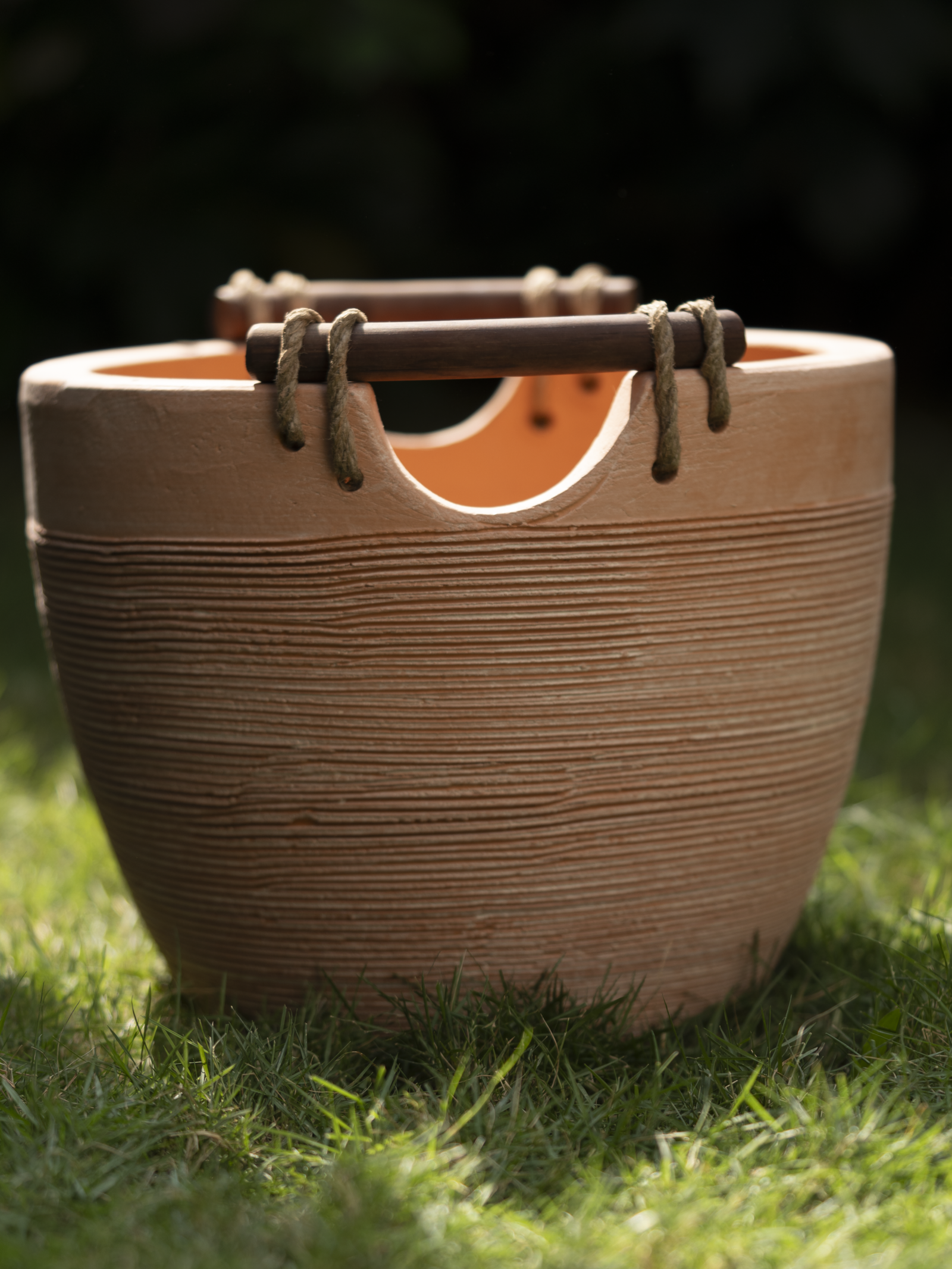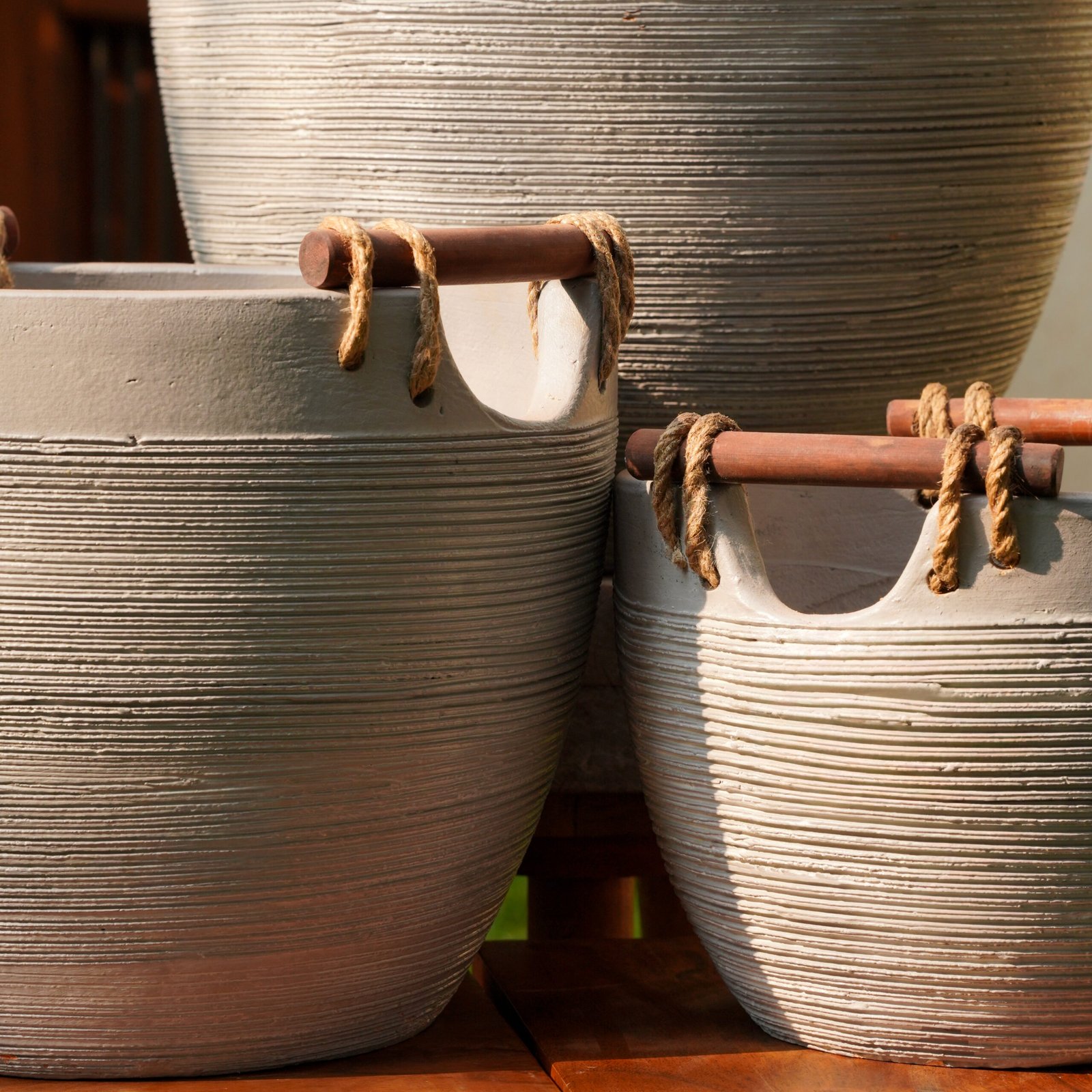 A set of three hand-textured terracotta planters in a matte stone-grey finish, each fitted with a turned wooden handle and natural jute cord. Quiet in form, considered in detail — made to hold and be moved with ease. Available in two shades – grey and terracotta