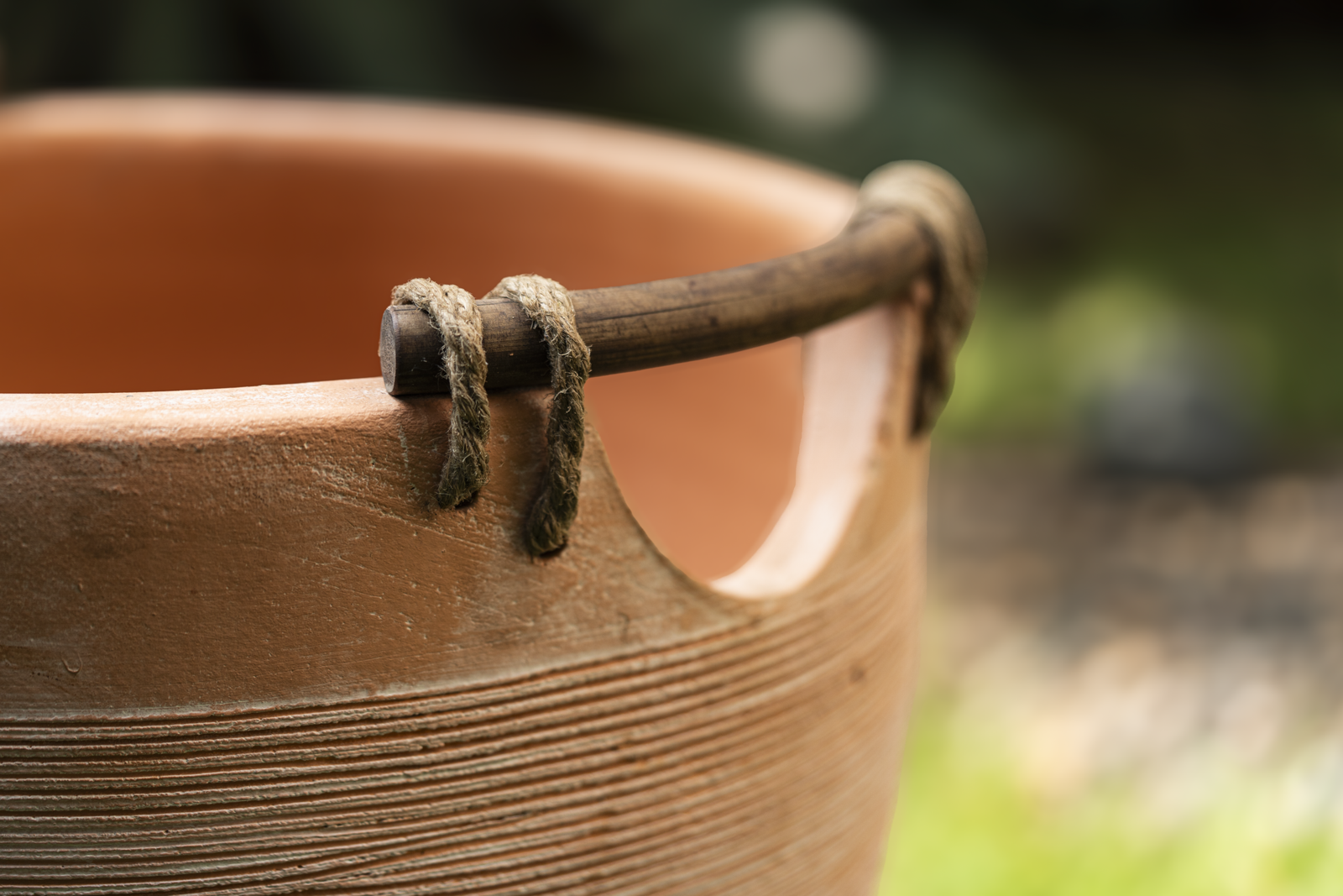 Materials: Hand-thrown terracotta · Stone-wash finish · Turned hardwood handle · Hand-knotted jute Drainage: Hole included · Saucers available separately
