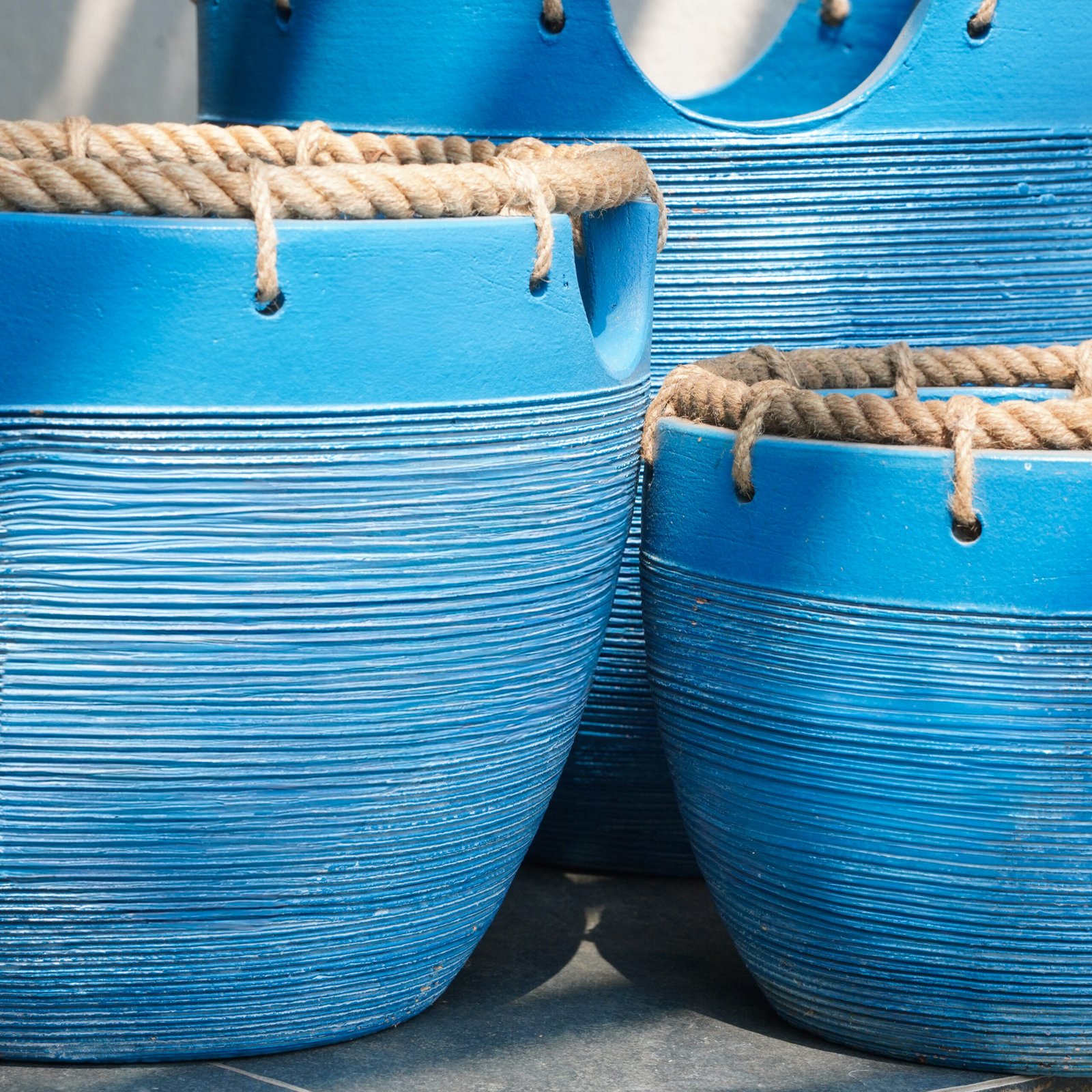 At the top, a length of heavy twisted jute rope is threaded through a series of punched holes just below the rim and looped at intervals around the outside of the pot. The rope is thick and coarse, left entirely natural and undyed. It sits in strong material contrast to the smooth, painted blue body beneath — rough against smooth, warm against cool, organic against considered. Cut-through handles are formed in the clay just below the rope line, providing functional grip for moving and repositioning.