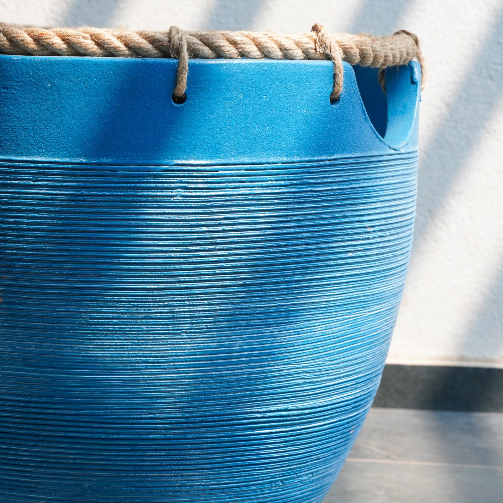 The ribbing itself is fine and closely spaced, applied by hand during forming and running continuously from the base to just below the rim. Where the lines catch the light obliquely — as seen here in morning sun — the surface takes on an almost textile quality, reminiscent of tightly wound rope or woven indigo cloth. This is the pot’s primary texture, and it works in complete contrast to the thick natural rope that finishes the rim.